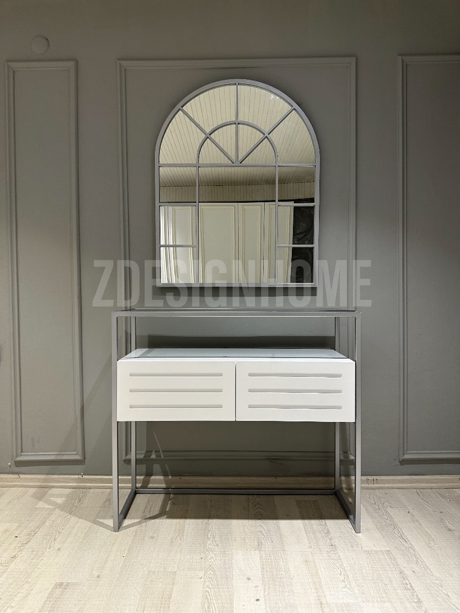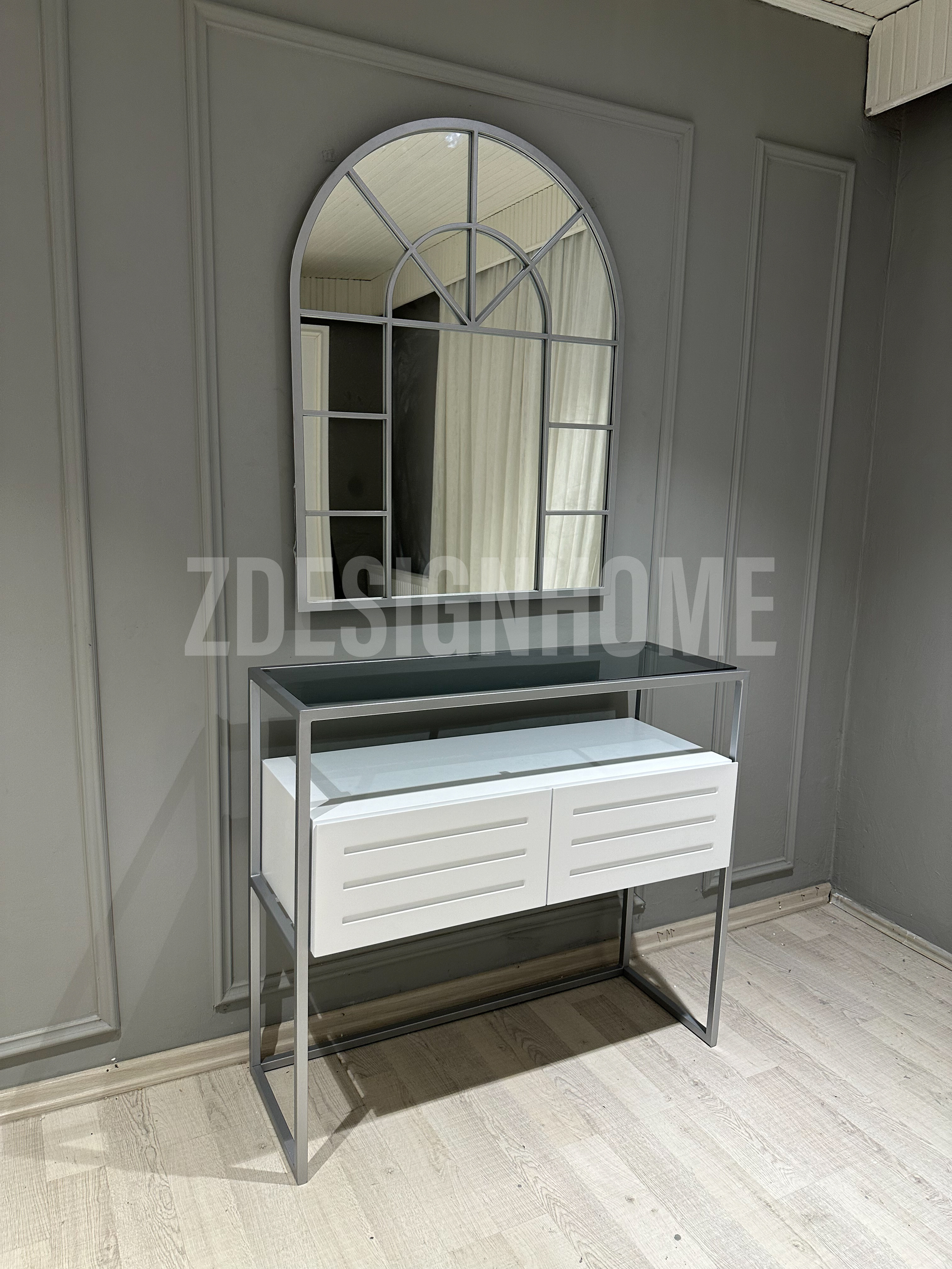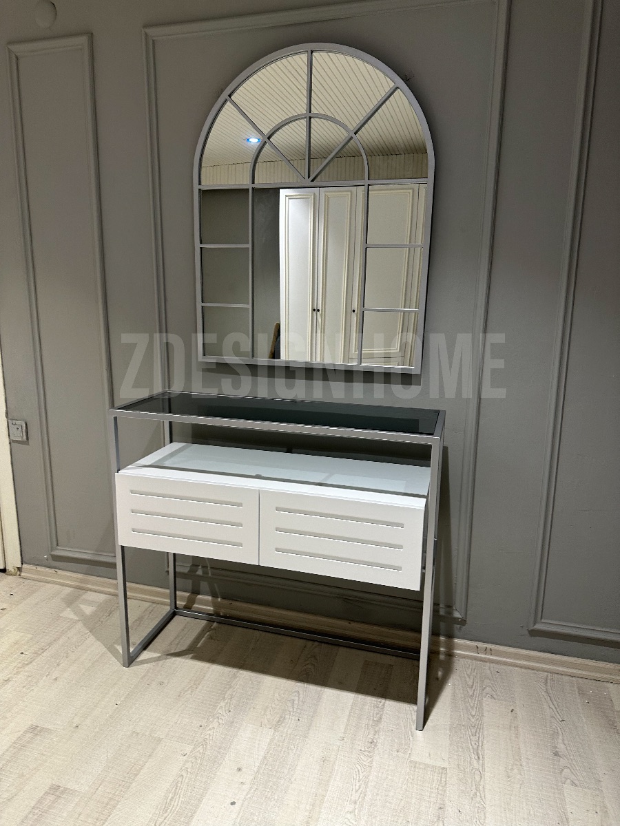 80x100 cm ölçülerindeki ayna ve 100x35x90 cm dresuar takımı, zarafeti ve fonksiyonelliği bir araya getirir. Ayna ve dresuar metal profilden üretilmiş olup, üst tabla MDF Lake ile kaplanmıştır. Çekmeceler beyaz renkte tasarlanmış ve kullanışlı depolama alanı sunar. Ürünler montaja gerek kalmadan hazır şekilde gönderilmektedir.
