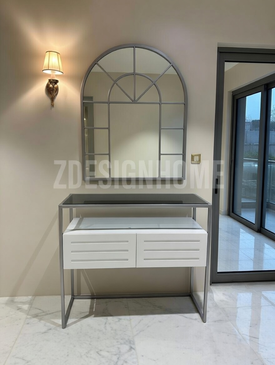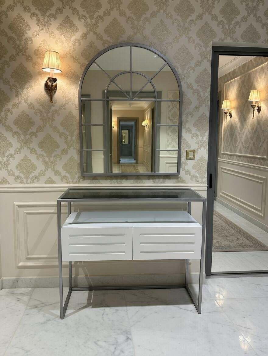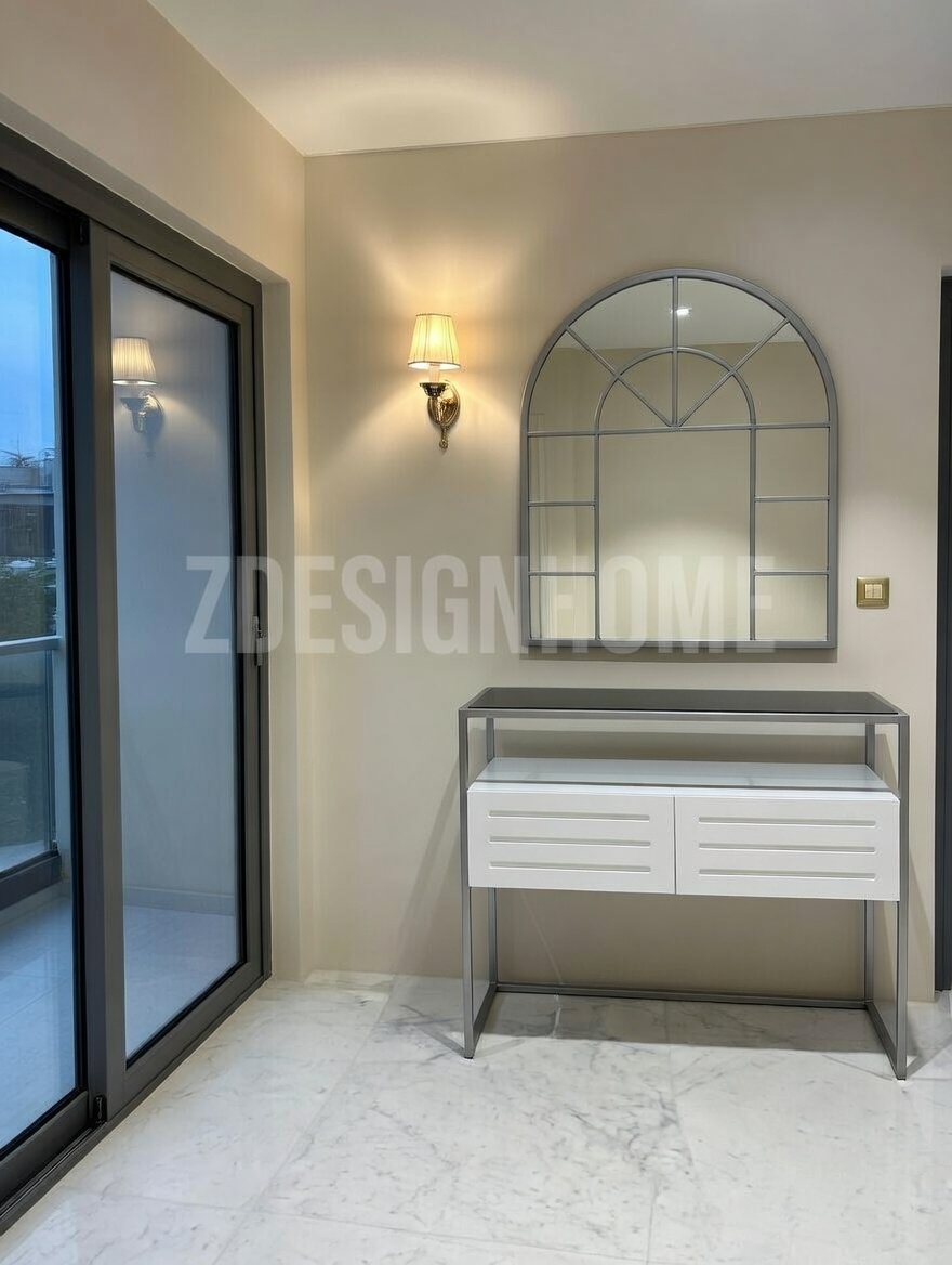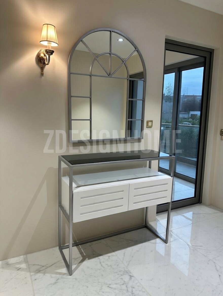 80x100 cm ölçülerindeki ayna ve 100x35x90 cm dresuar takımı, zarafeti ve fonksiyonelliği bir araya getirir. Ayna ve dresuar metal profilden üretilmiş olup, üst tabla MDF Lake ile kaplanmıştır. Çekmeceler beyaz renkte tasarlanmış ve kullanışlı depolama alanı sunar. Ürünler montaja gerek kalmadan hazır şekilde gönderilmektedir.