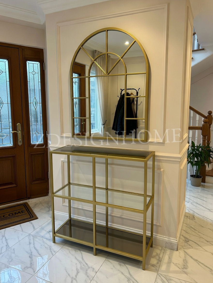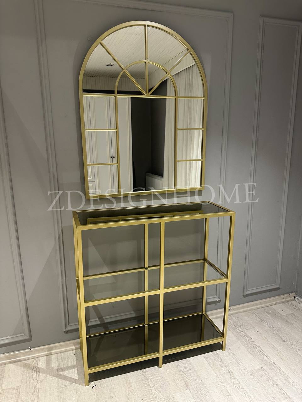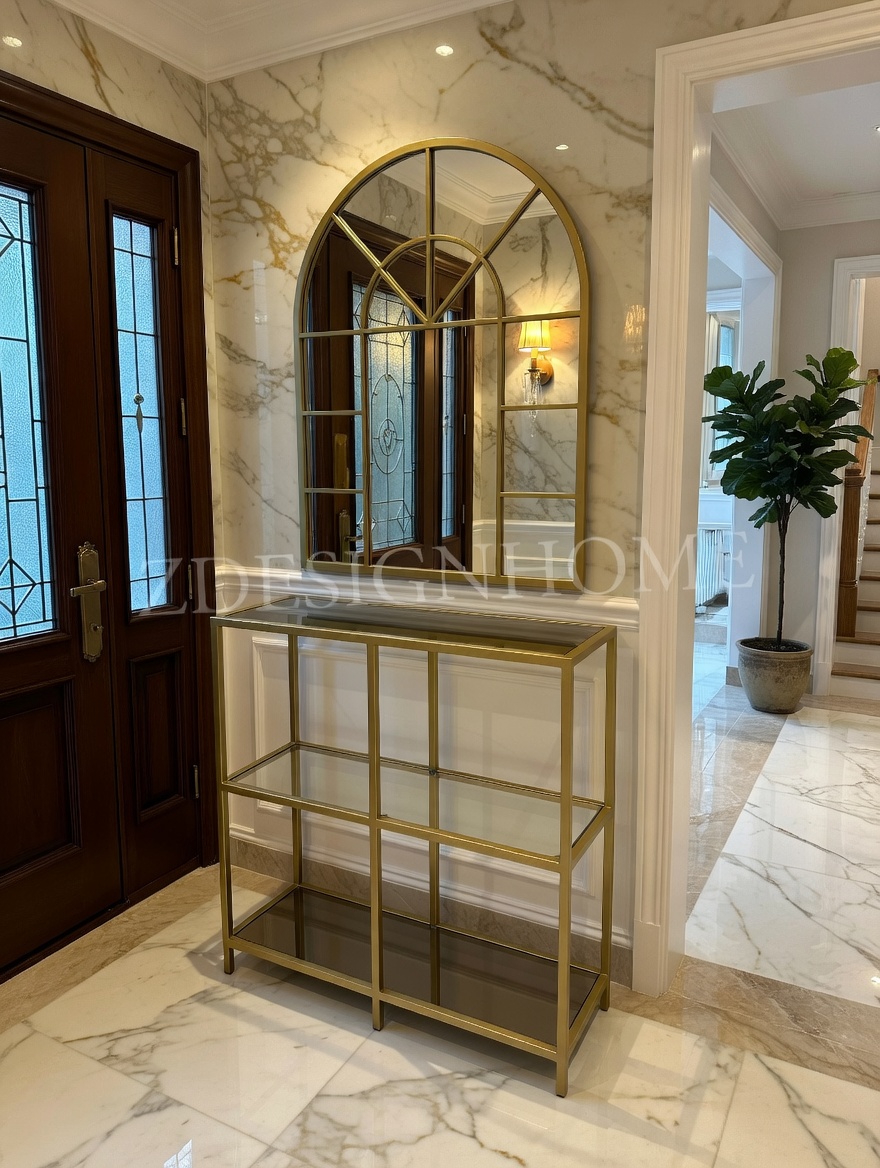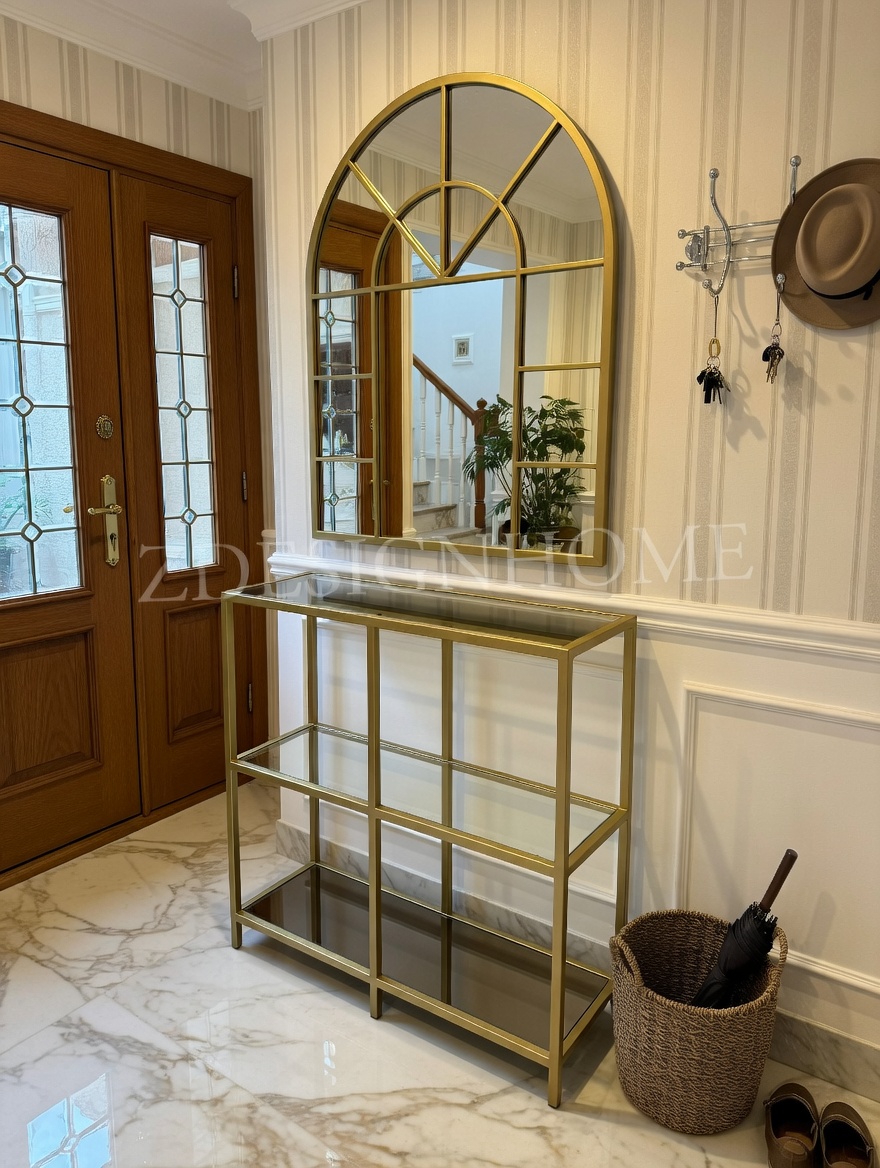 tasarımına ayrı bir dokunuş katarken, cam yüzeyindeki bronz ayna raf da odanıza