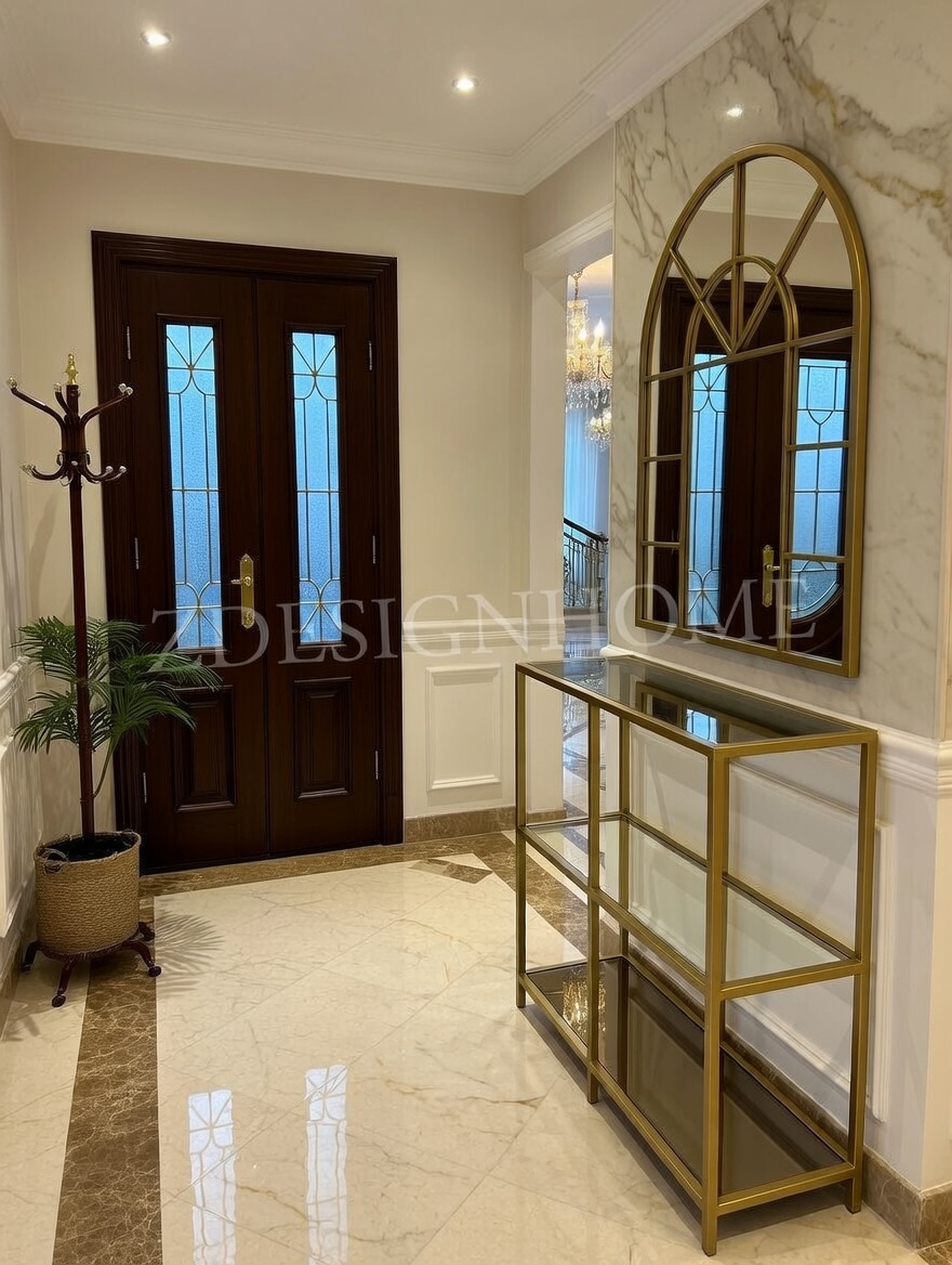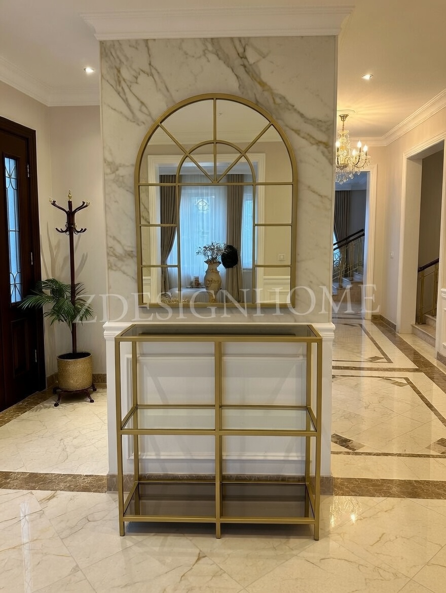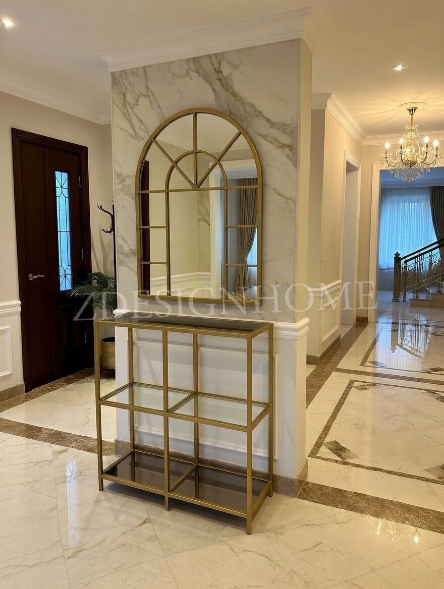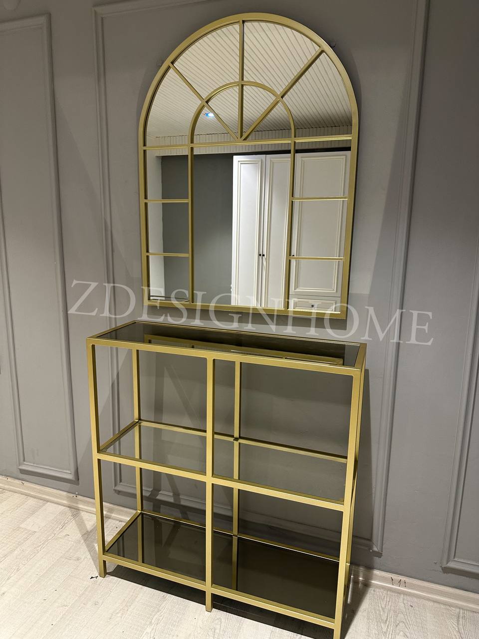 tasarımına ayrı bir dokunuş katarken, cam yüzeyindeki bronz ayna raf da odanıza