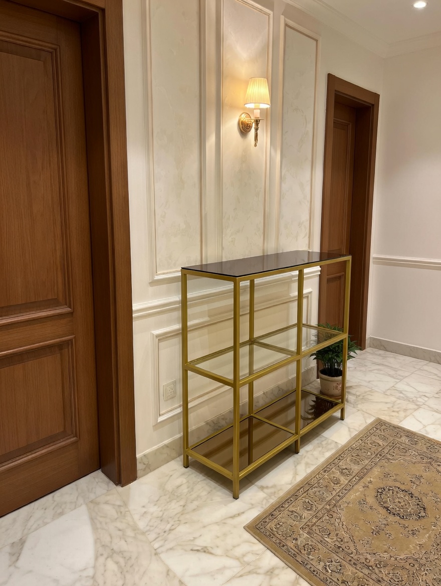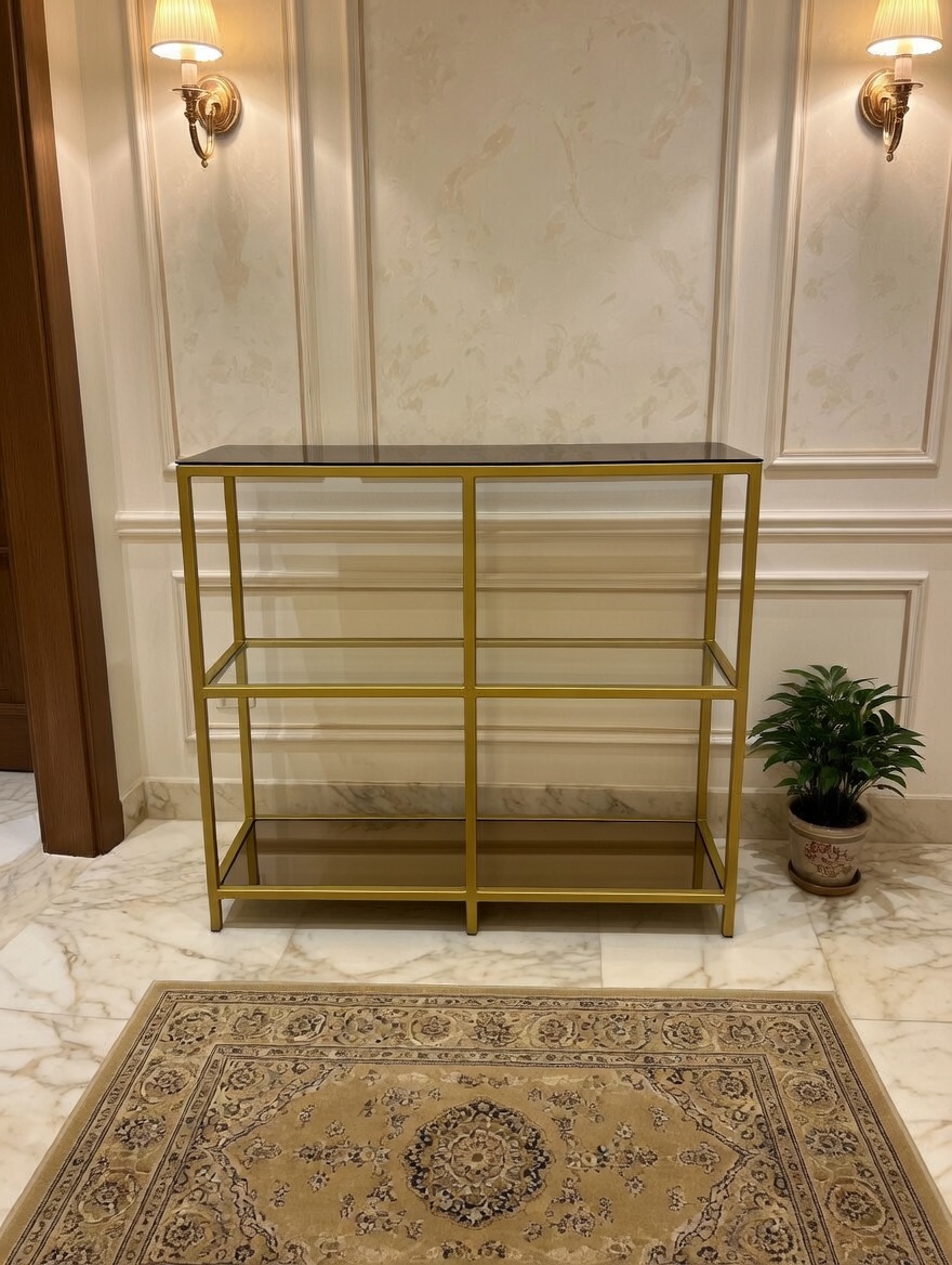 katarken, cam yüzeyindeki bronz ayna raf da odanıza modern bir hava katar. Bu