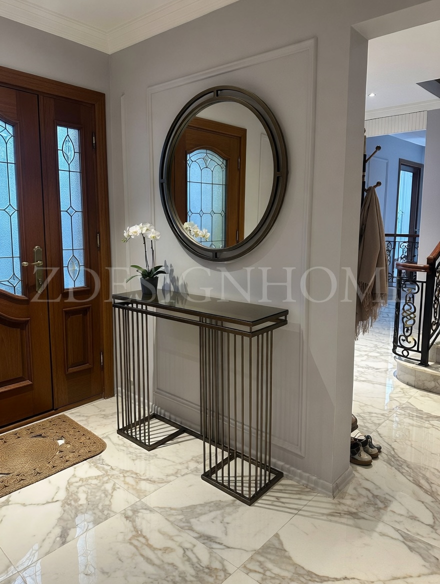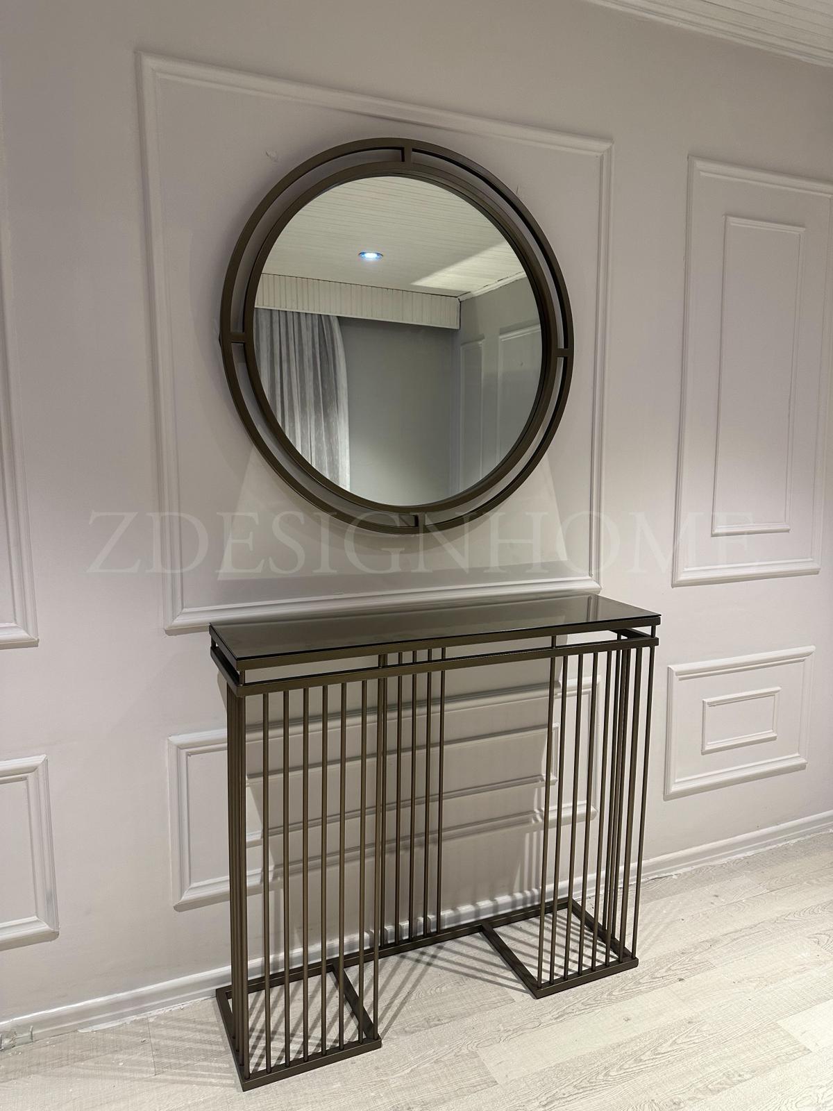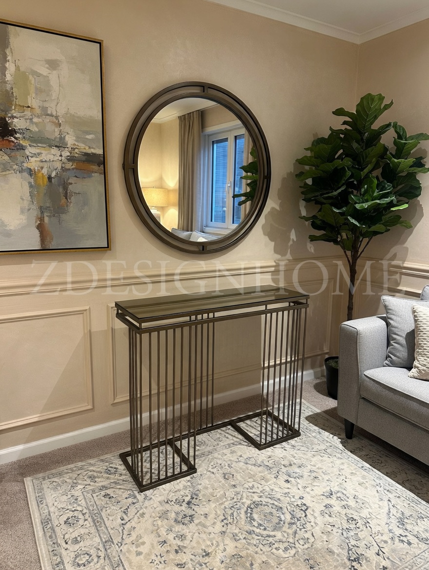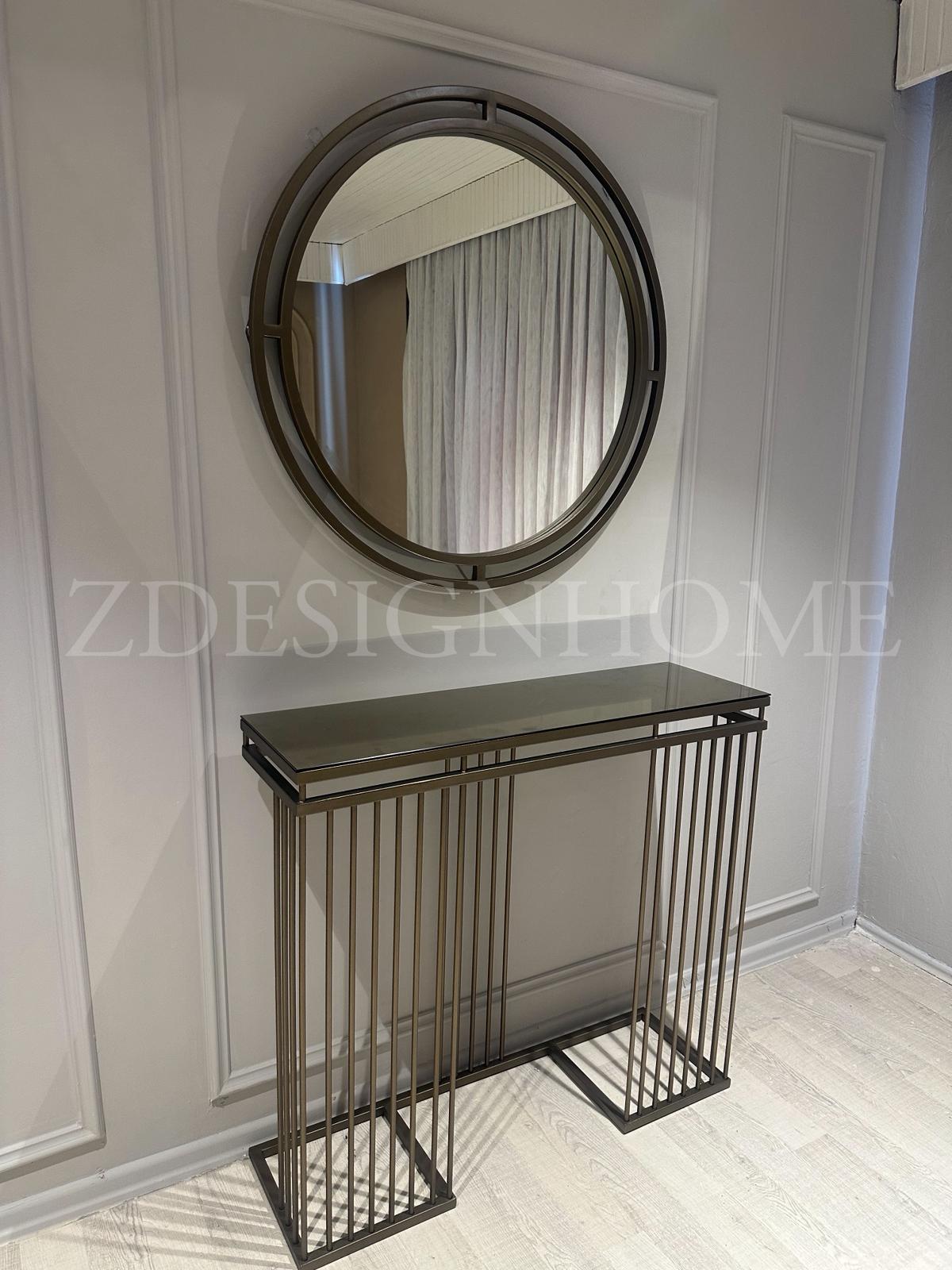 Modelin en dikkat çekici detaylarından biri bronz ayna raf tasarımıdır. Cam yüzey üzerinde yer alan bu bronz raf, ürüne hem modern hem de şık bir karakter kazandırır. Eskitme gold ayaklar ise tasarımın zarafetini tamamlayan estetik bir dokunuş sunar.