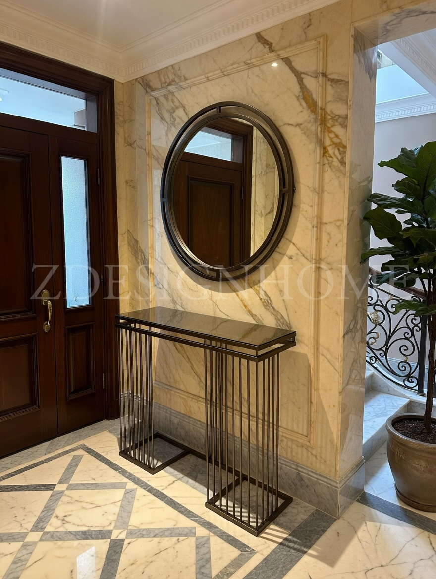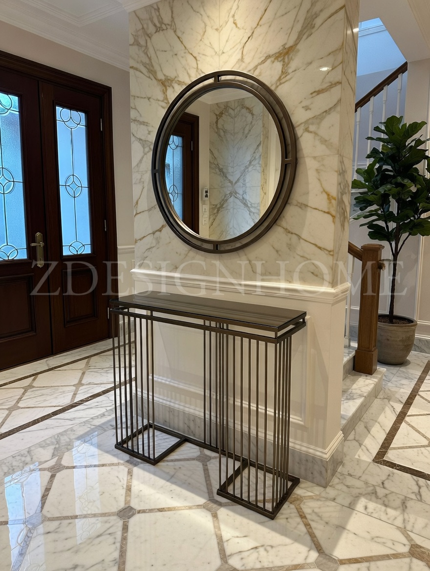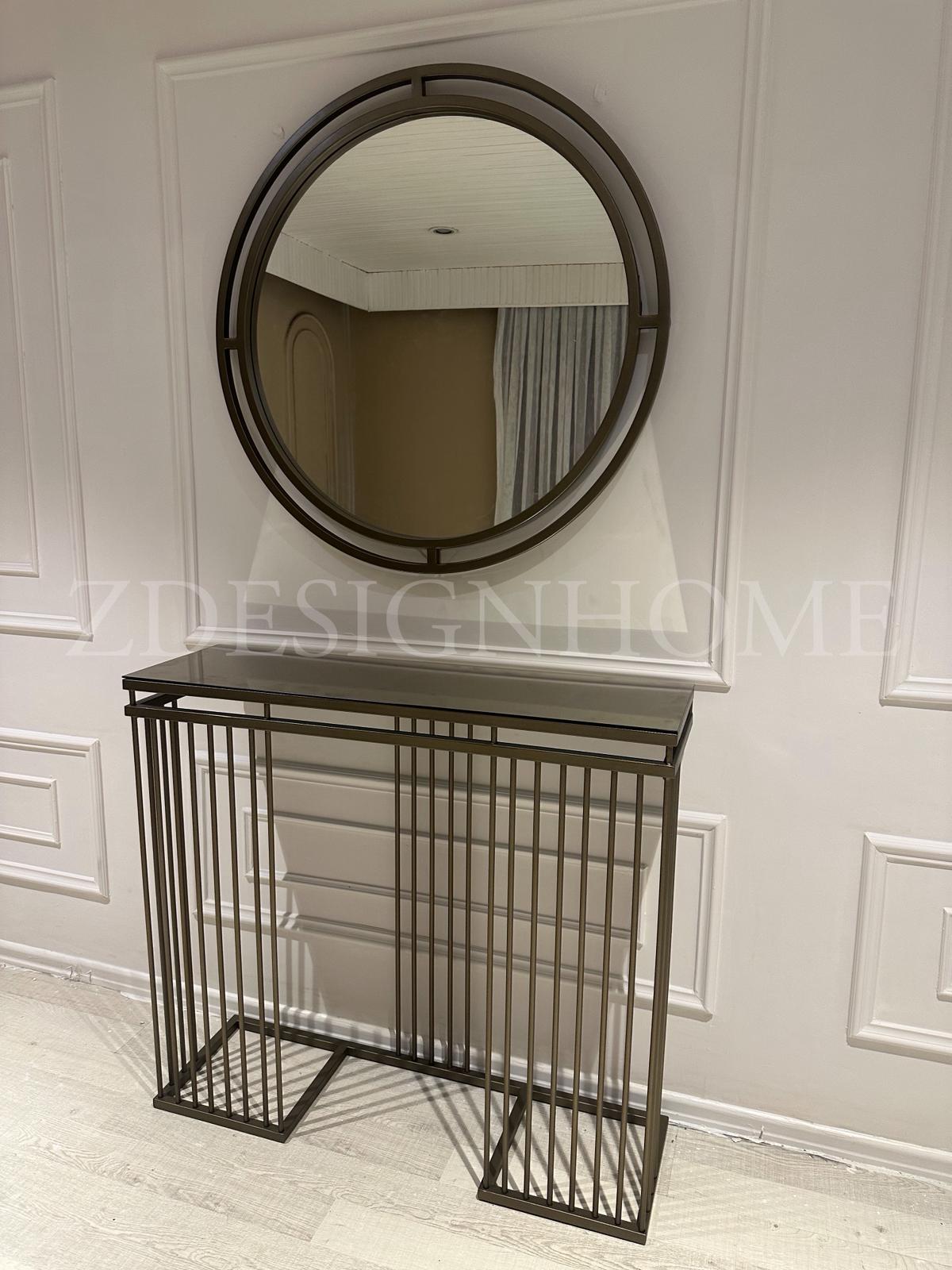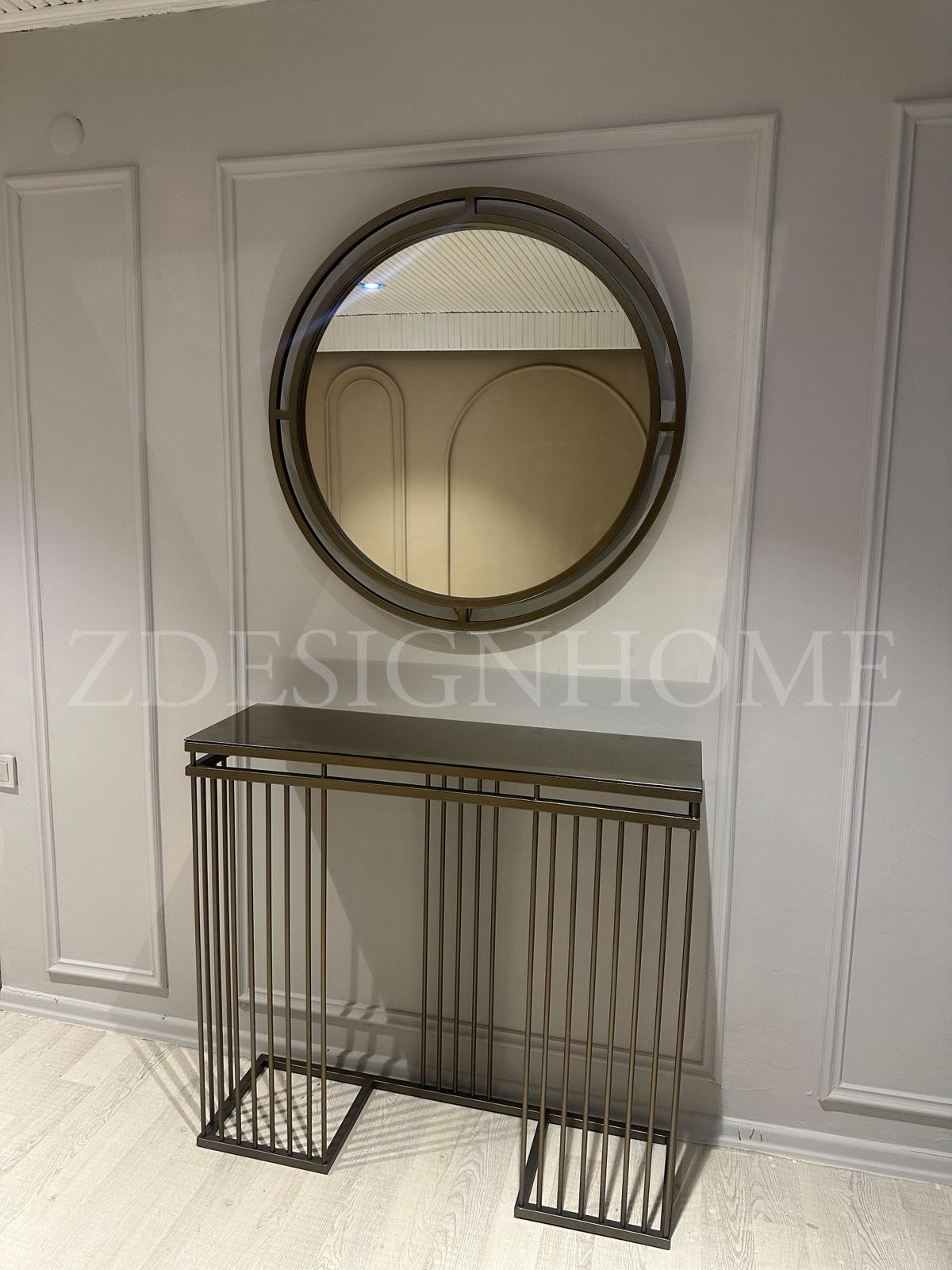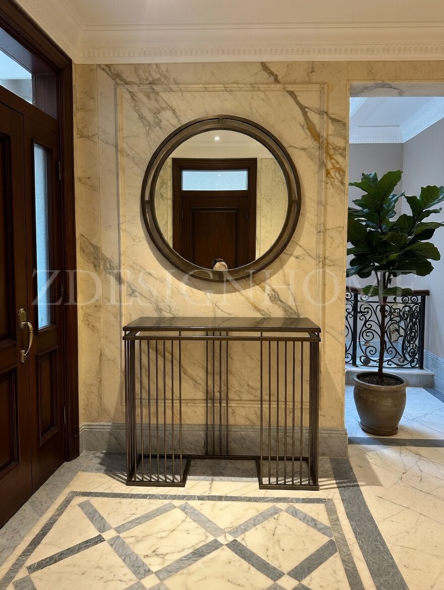 Modelin en dikkat çekici detaylarından biri bronz ayna raf tasarımıdır. Cam yüzey üzerinde yer alan bu bronz raf, ürüne hem modern hem de şık bir karakter kazandırır. Eskitme gold ayaklar ise tasarımın zarafetini tamamlayan estetik bir dokunuş sunar.