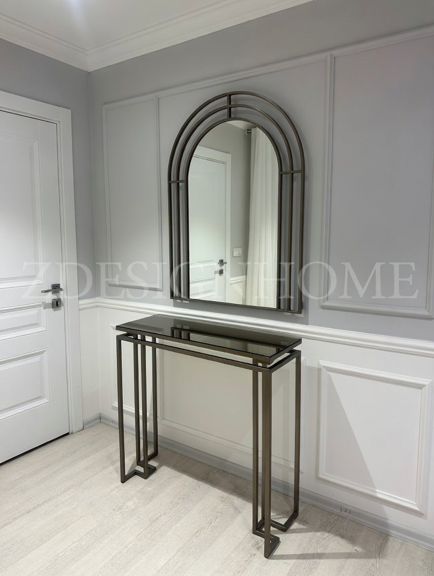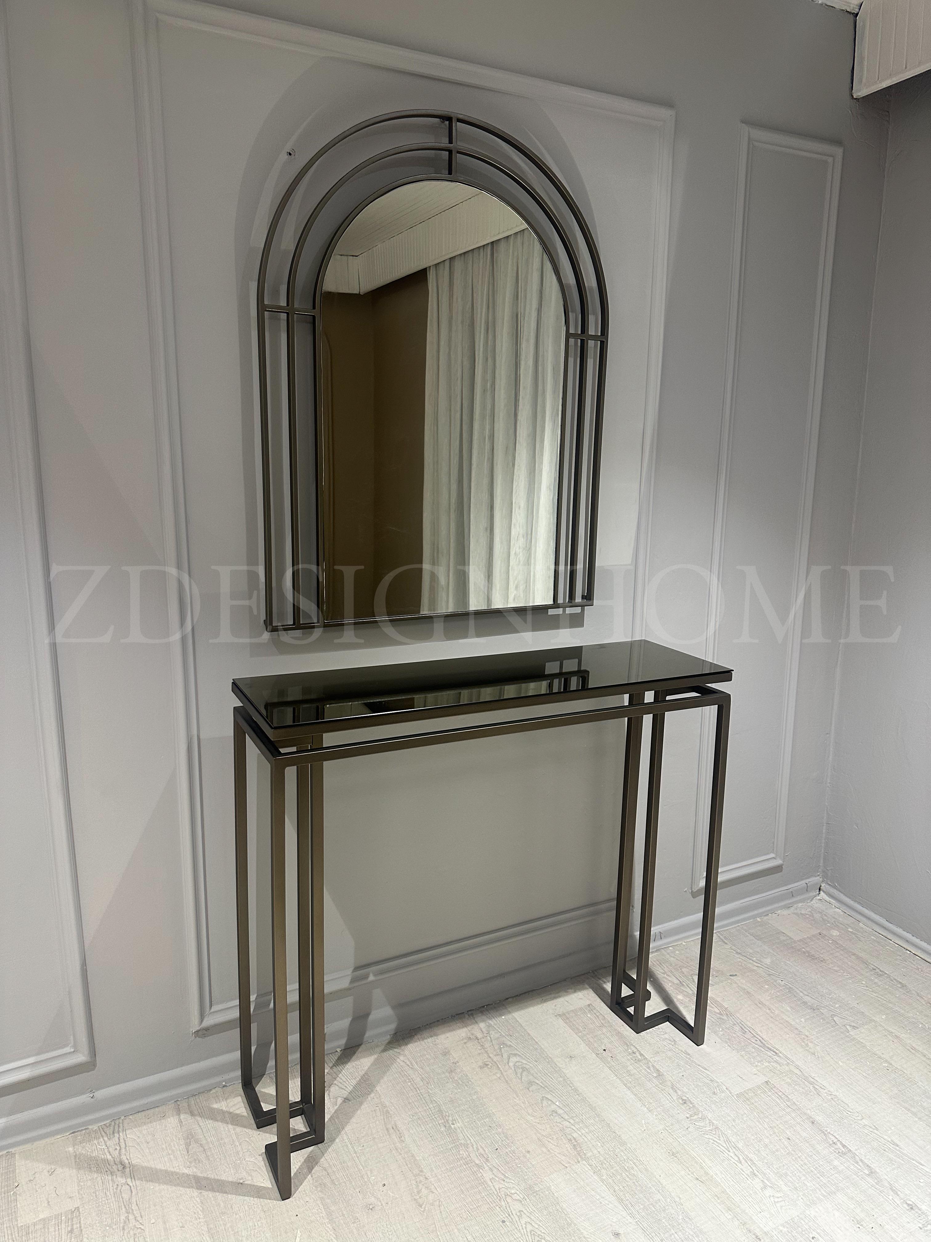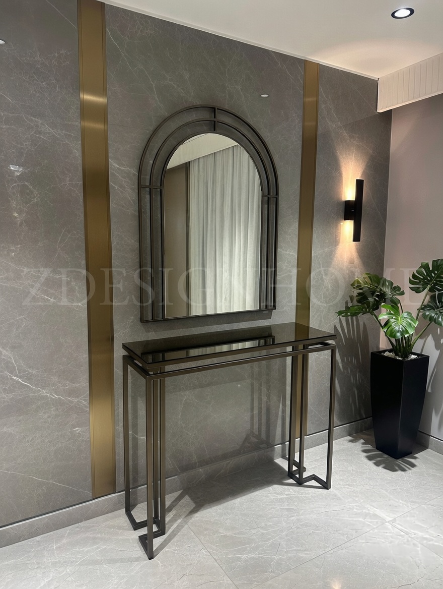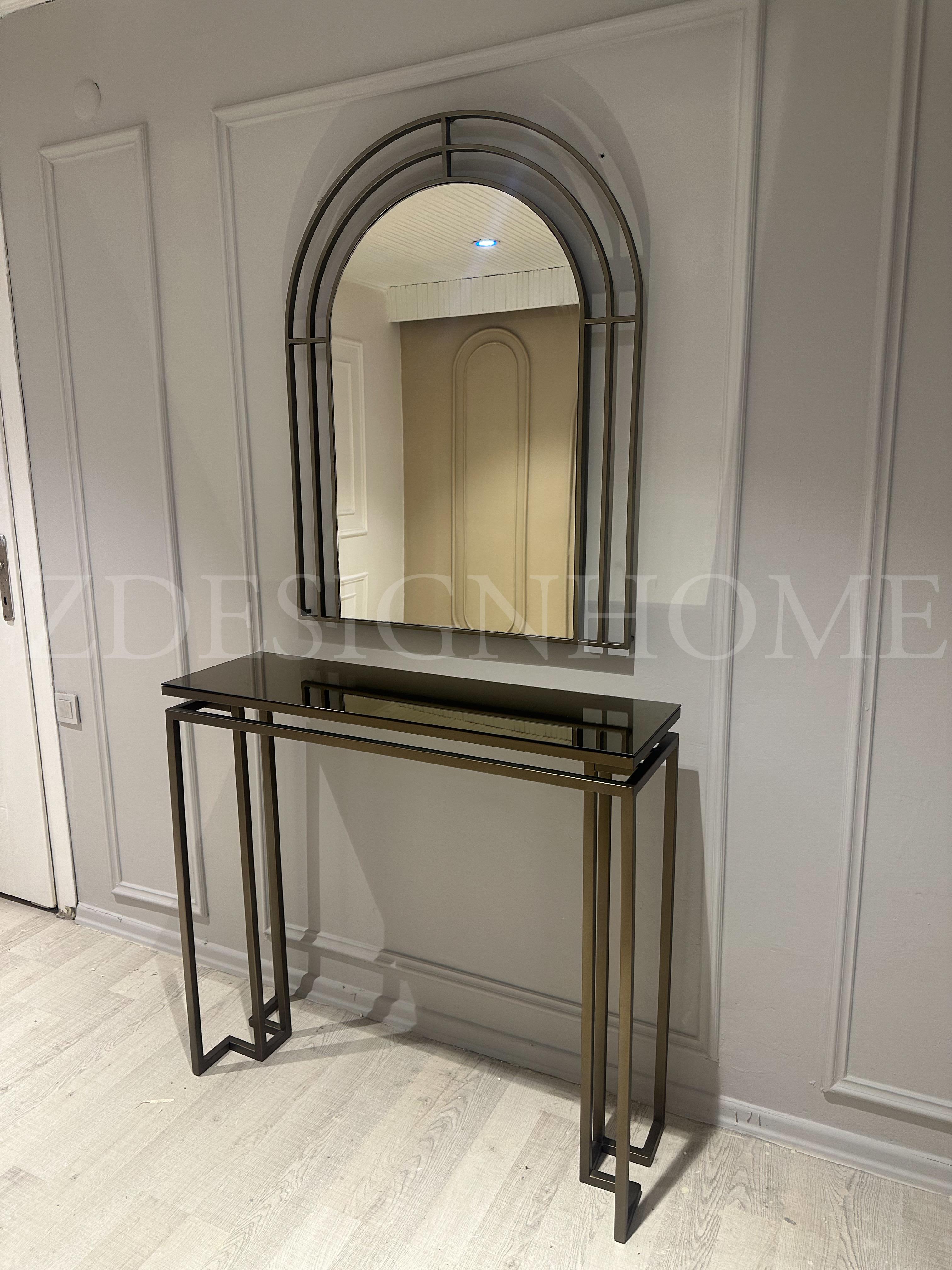 Modelin en dikkat çekici detaylarından biri bronz ayna raf tasarımıdır. Cam yüzey üzerinde yer alan bu bronz raf, ürüne hem modern hem de şık bir karakter kazandırır. Eskitme gold ayaklar ise tasarımın zarafetini tamamlayan estetik bir dokunuş sunar.
