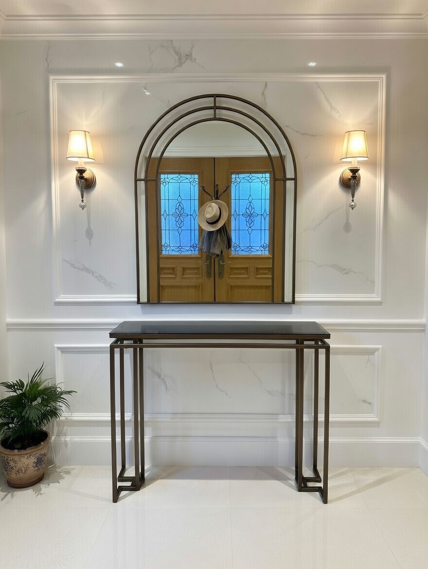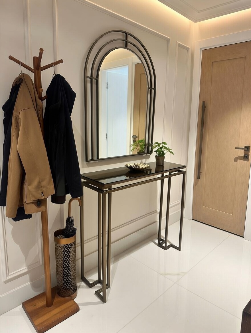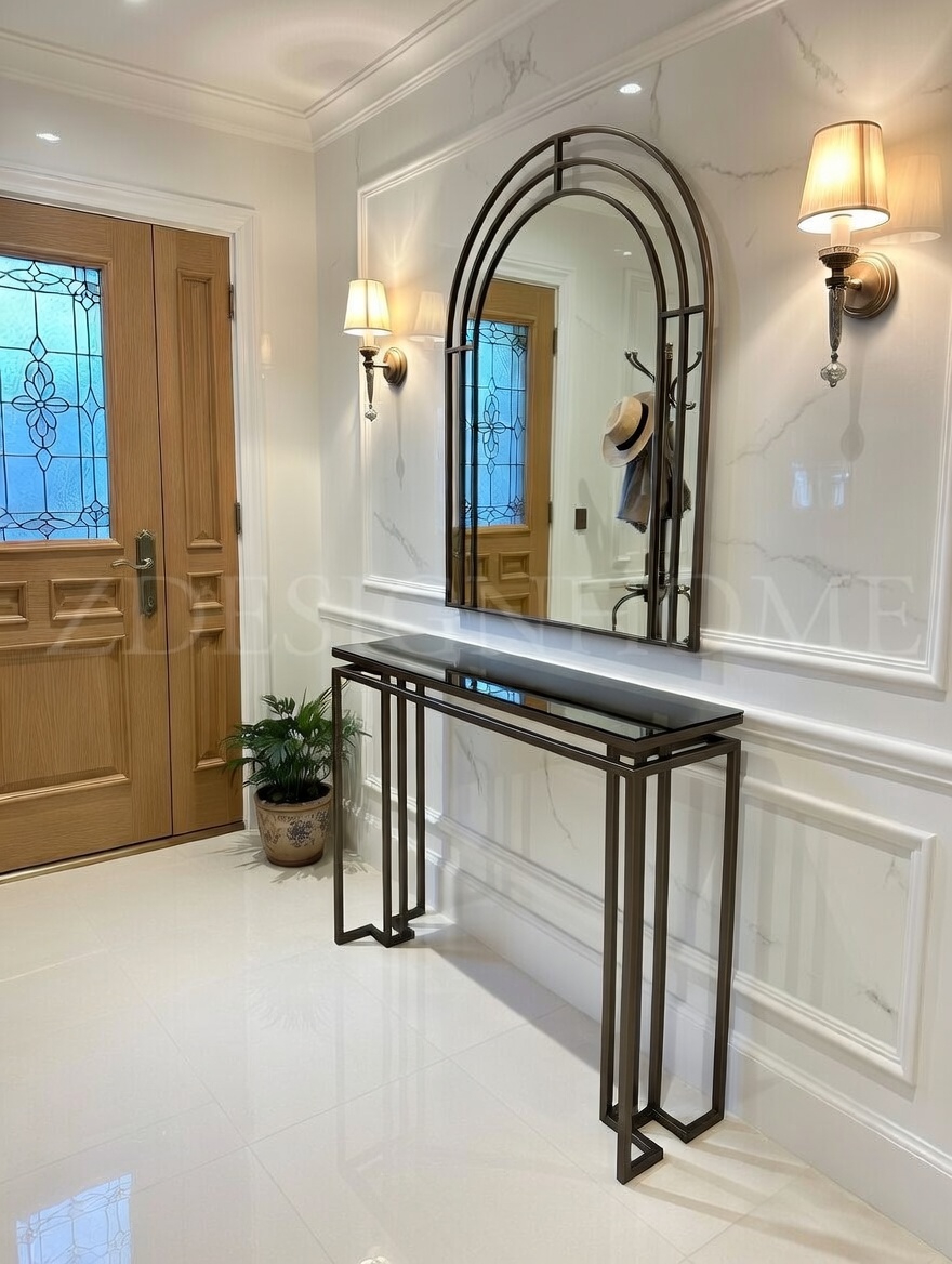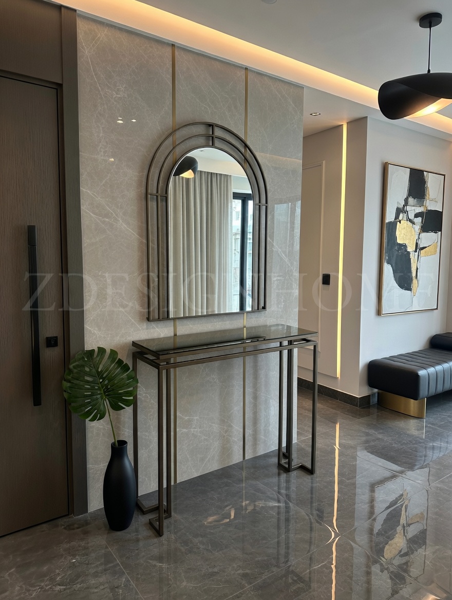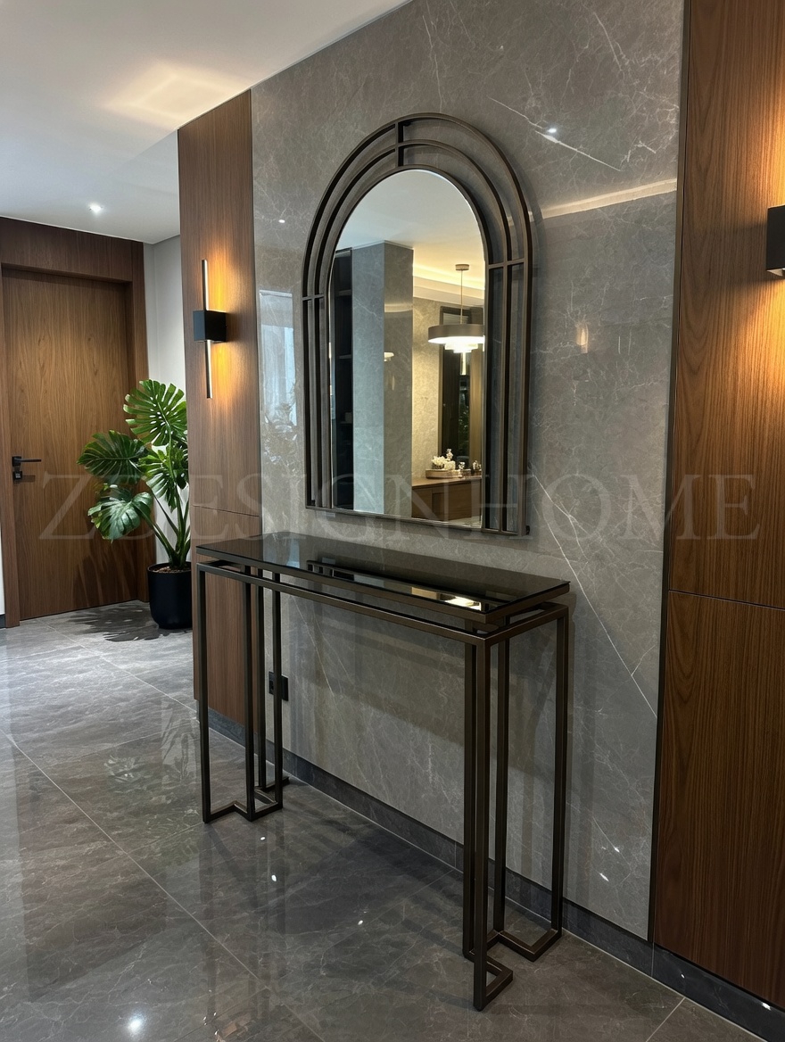 Modelin en dikkat çekici detaylarından biri bronz ayna raf tasarımıdır. Cam yüzey üzerinde yer alan bu bronz raf, ürüne hem modern hem de şık bir karakter kazandırır. Eskitme gold ayaklar ise tasarımın zarafetini tamamlayan estetik bir dokunuş sunar.