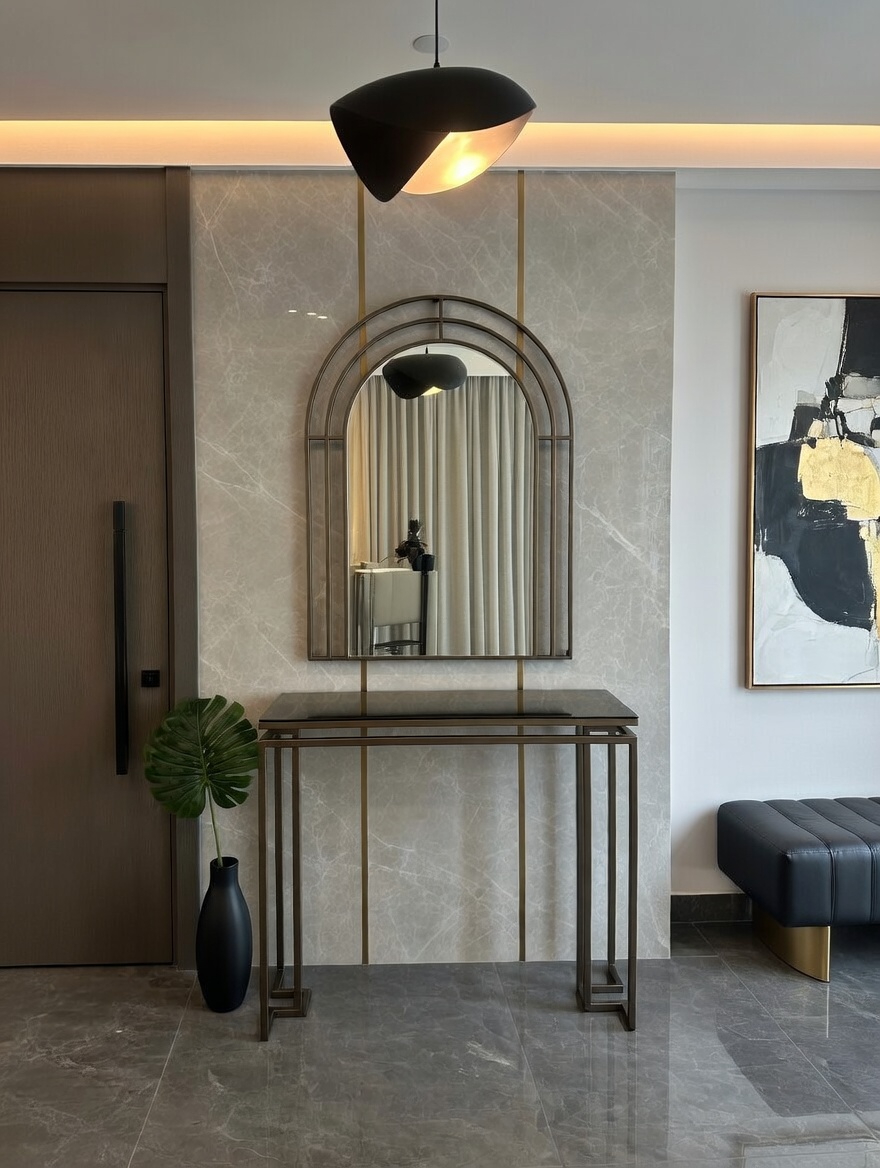 100 × 30 × 90 cm ölçülerindeki dresuar, geniş ve kullanışlı yüzeyi sayesinde hem dekoratif hem de pratik bir kullanım sunar. Takıma eşlik eden 80-100 cm ölçülerindeki ayna, bronz detaylarıyla bulunduğu mekâna derinlik ve modern bir görünüm kazandırır.