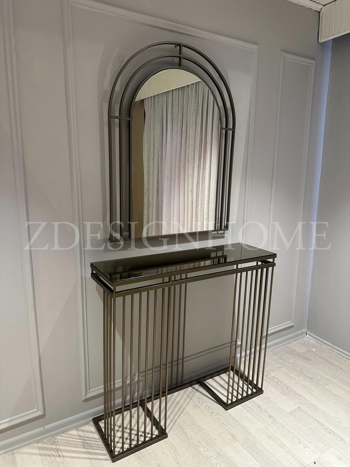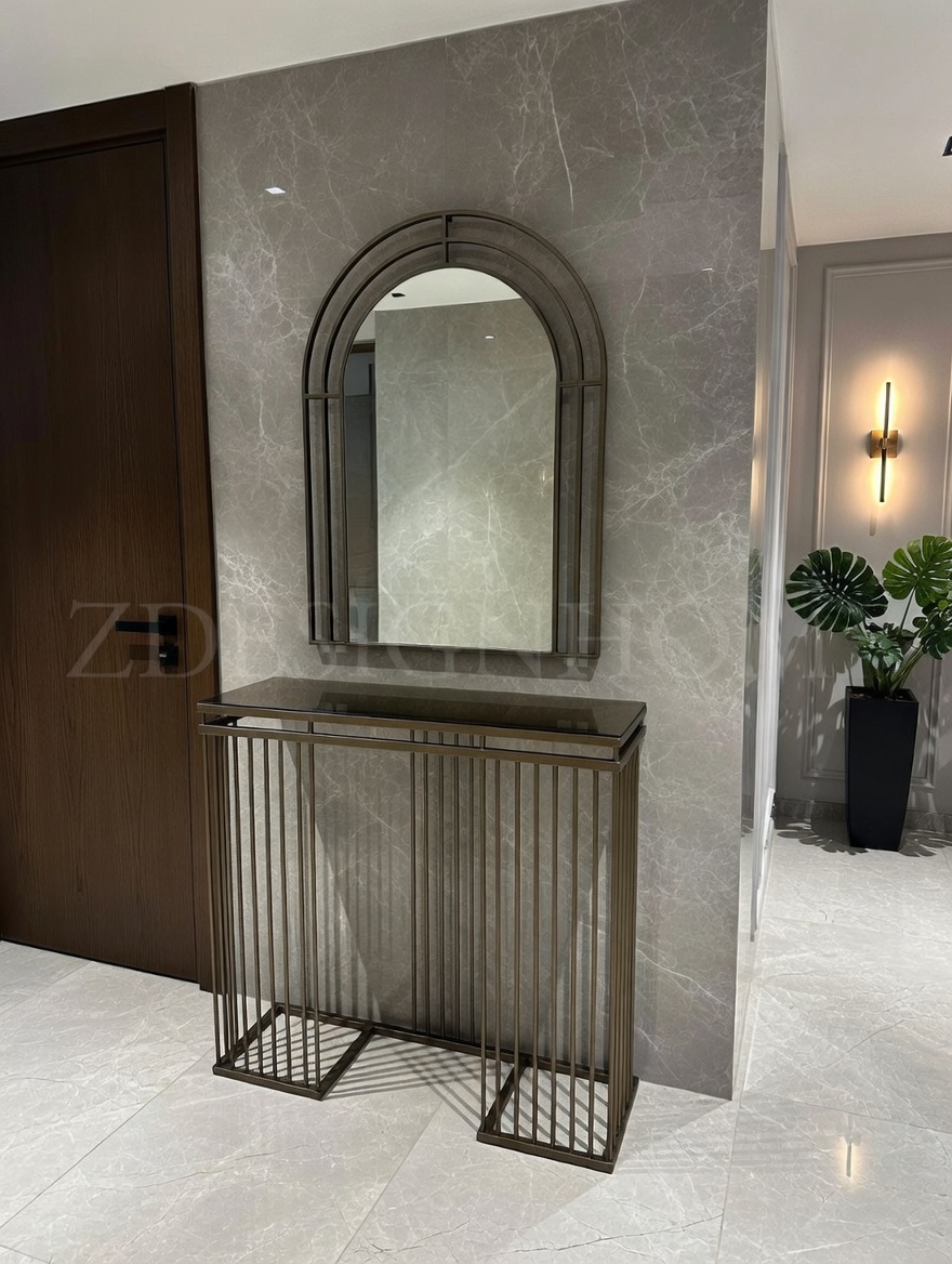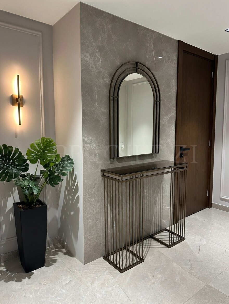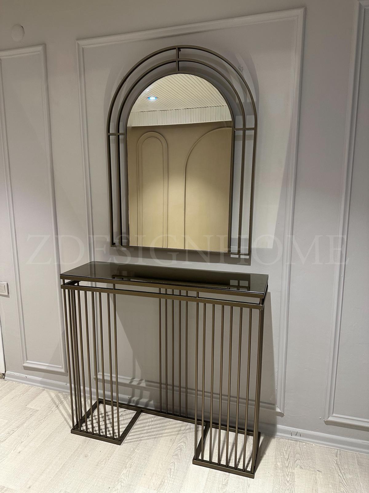 Modelin en dikkat çekici detaylarından biri bronz ayna raf tasarımıdır. Cam yüzey üzerinde yer alan bu bronz raf, ürüne hem modern hem de şık bir karakter kazandırır. Eskitme gold ayaklar ise tasarımın zarafetini tamamlayan estetik bir dokunuş sunar.