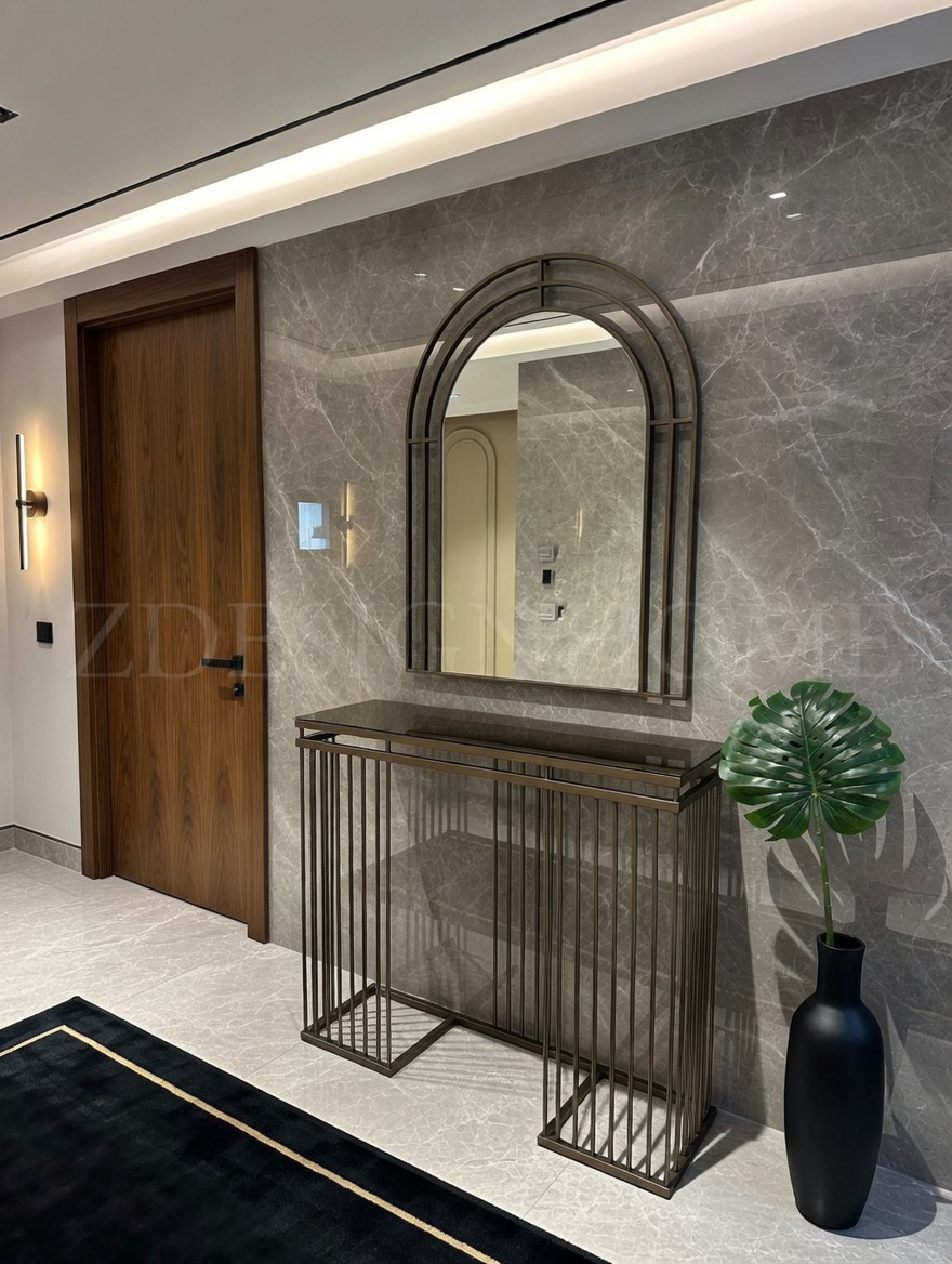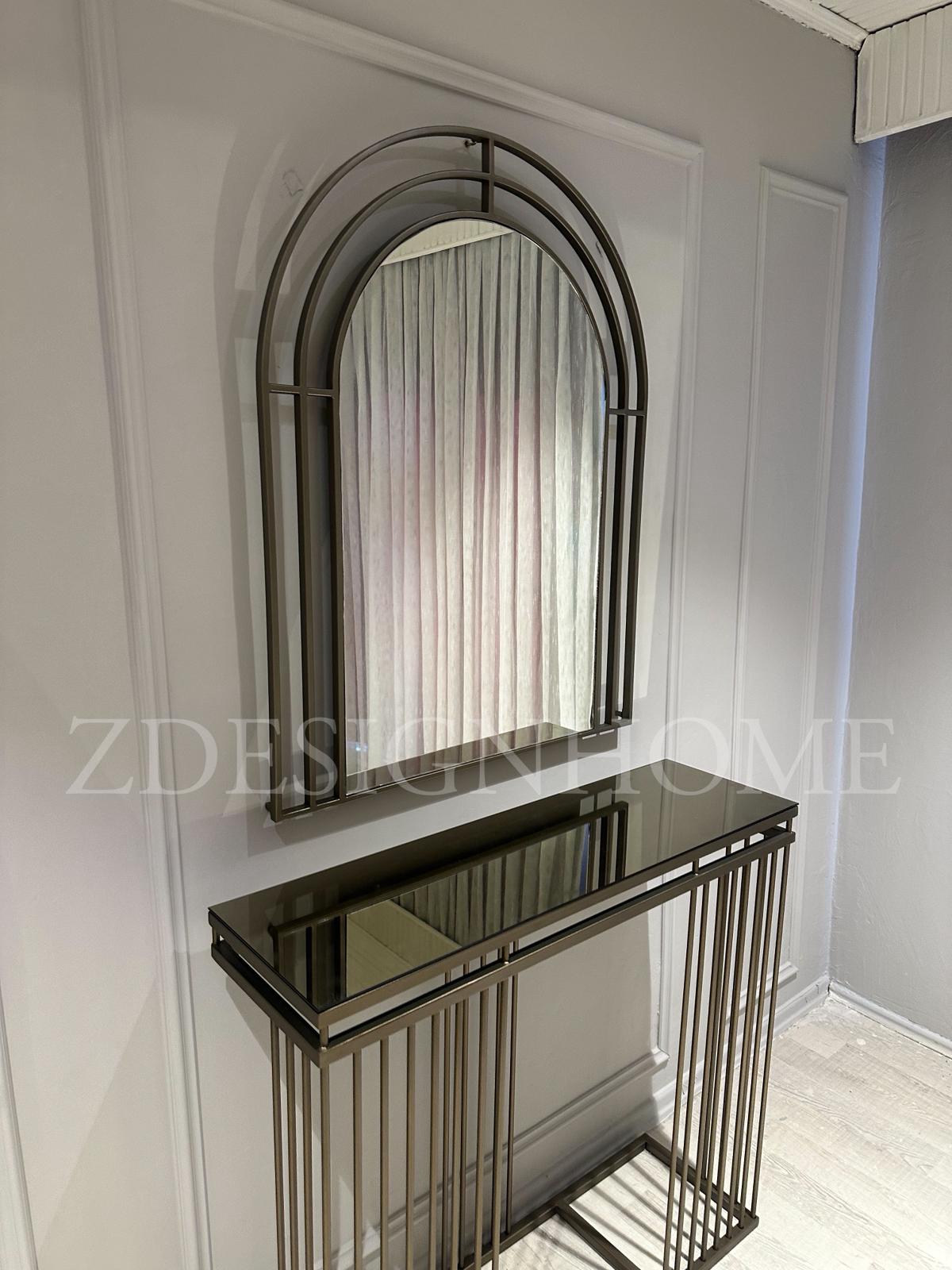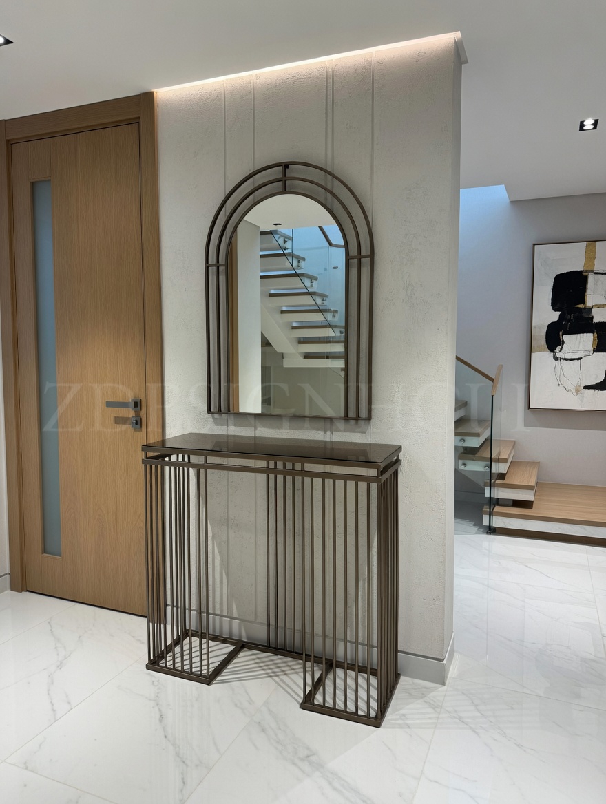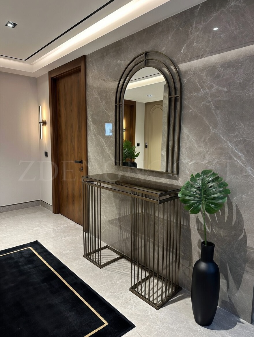 Modelin en dikkat çekici detaylarından biri bronz ayna raf tasarımıdır. Cam yüzey üzerinde yer alan bu bronz raf, ürüne hem modern hem de şık bir karakter kazandırır. Eskitme gold ayaklar ise tasarımın zarafetini tamamlayan estetik bir dokunuş sunar.