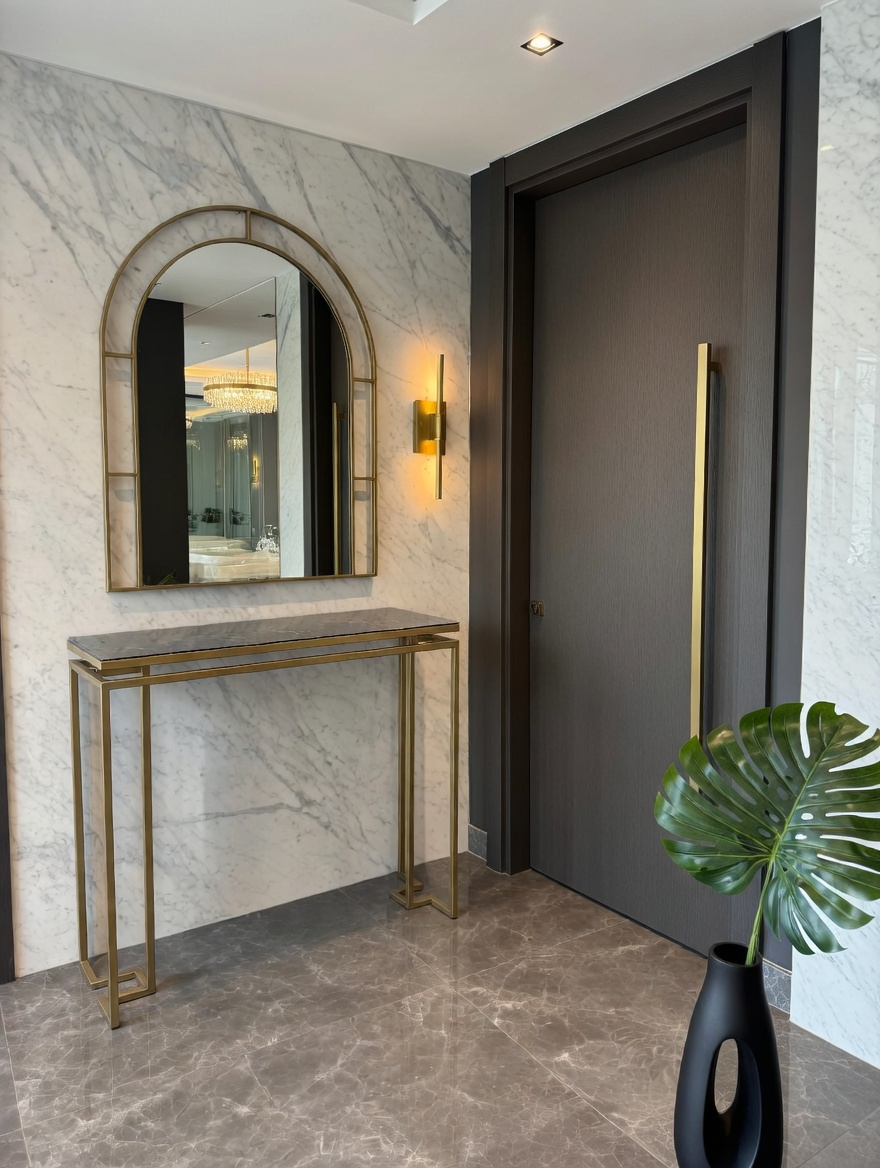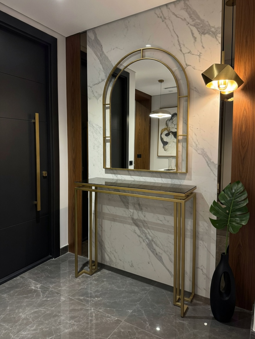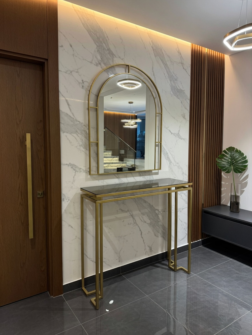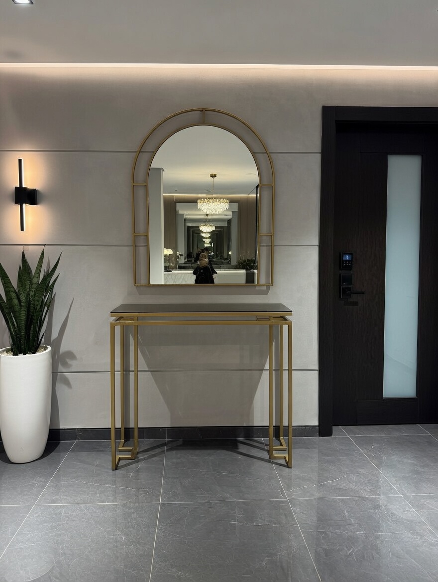 Modelin en dikkat çekici detaylarından biri bronz ayna raf tasarımıdır. Bu özel raf detayı hem kullanışlı bir alan sunar hem de ürüne modern ve şık bir karakter kazandırır. Ayak kısmında bulunan gold detaylar, tasarımın zarafetini tamamlayan estetik bir dokunuş oluşturur.