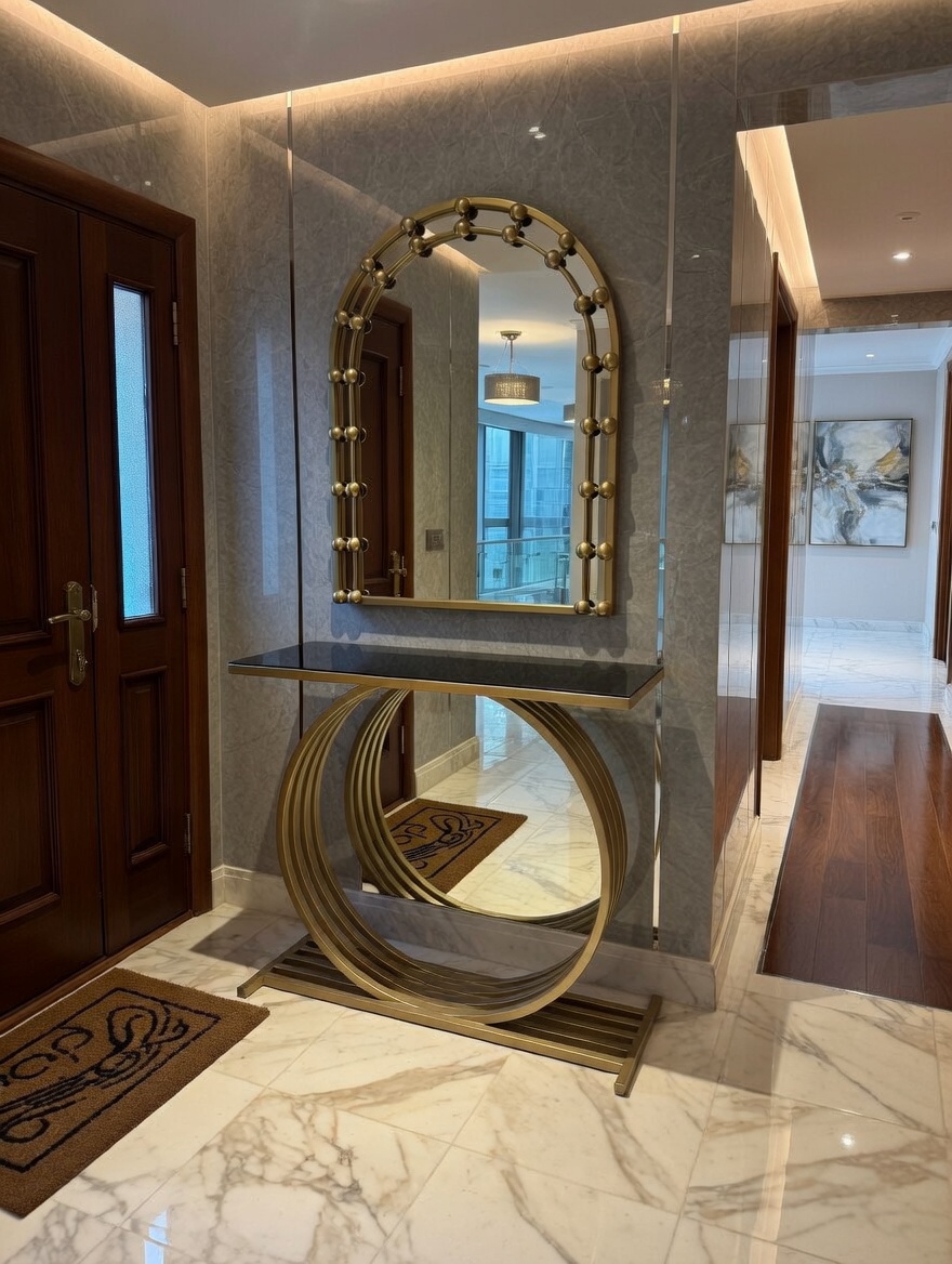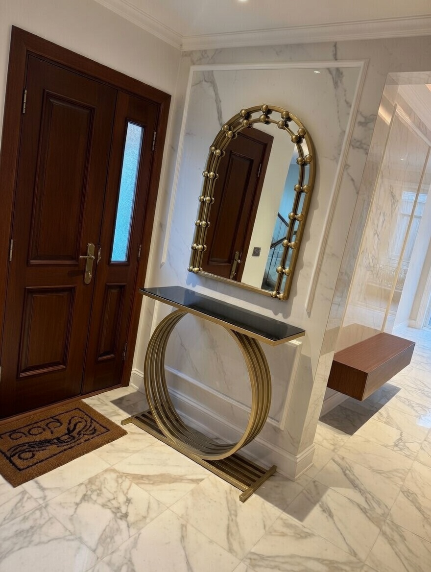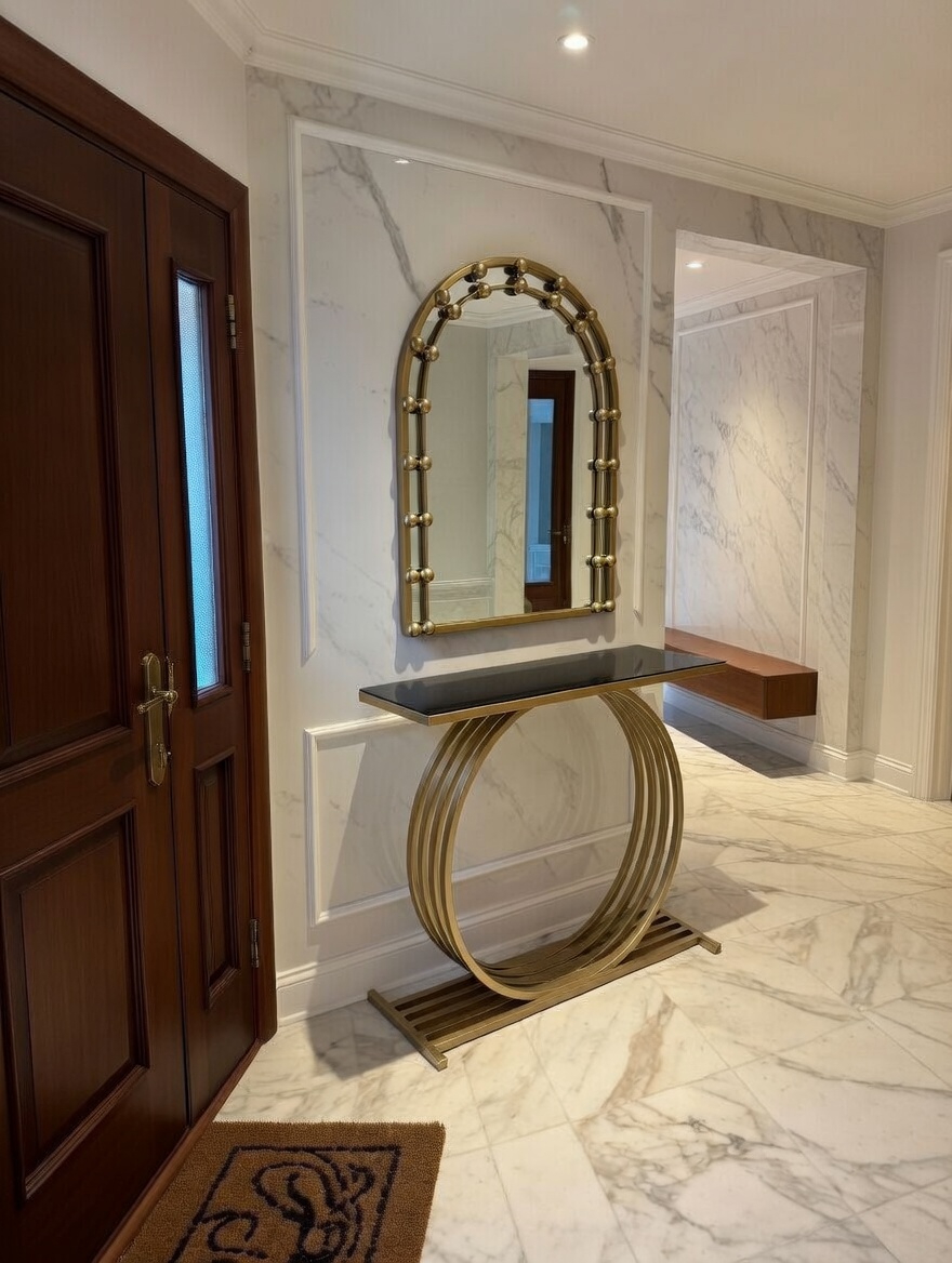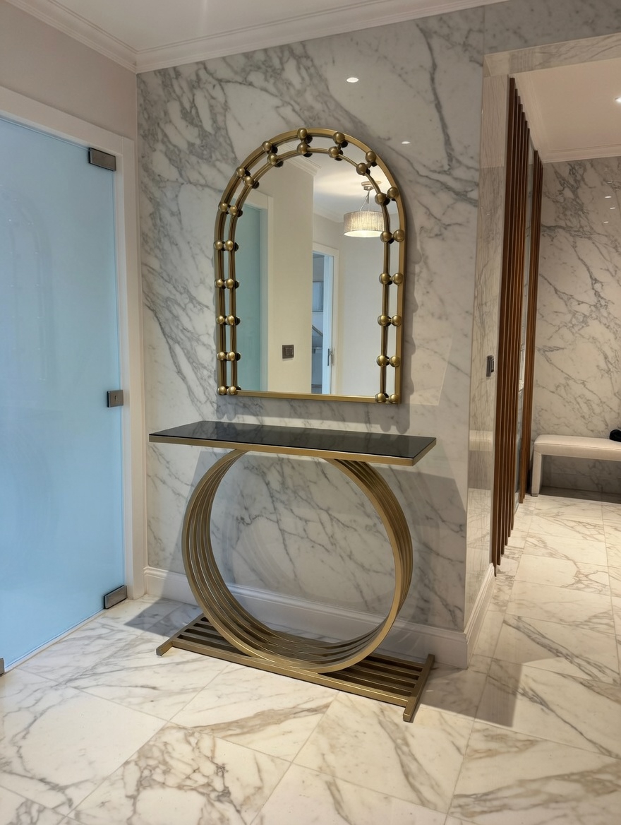 Modelin en dikkat çekici detaylarından biri bronz ayna raf tasarımıdır. Bu özel raf detayı hem kullanışlı bir alan sunar hem de ürüne modern ve şık bir karakter kazandırır. Ayak kısmında bulunan gold detaylar ise tasarımın zarafetini tamamlayan estetik bir dokunuş oluşturur.