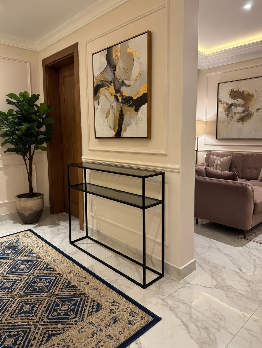 İnce formu sayesinde dar alanlarda bile rahatlıkla kullanılabilirken, üst ve alt cam rafları ile dekoratif ve kullanışlı bir alan oluşturur.
